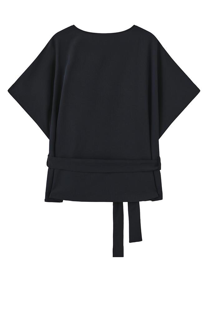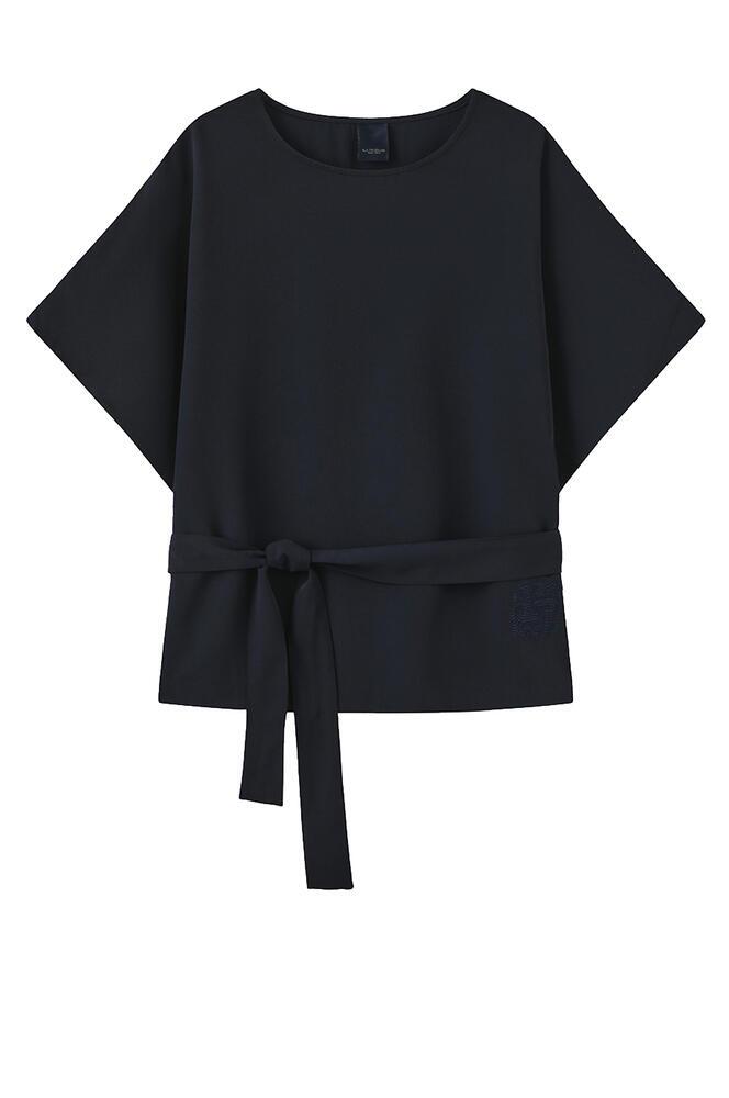 Elegant bluse fra Luxzuz One Two med rund hals og korte, brede ærmer, i en marineblå nuance. Blusen har et aftageligt bindebånd i taljen, samt et diskret broderi nederst i venstre side - en feminin bluse med god og alsidig pasform.