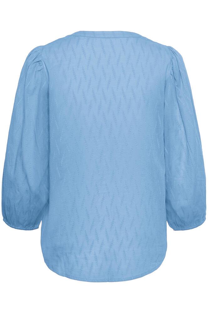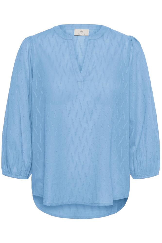 Smuk bluse fra KAFFE i en sommerlig, lyseblå nuance med let transparent i stoffet. Blusen er med en fin notch-udskæring og 3/4 ærmer med let puff og elastik, samt i en let og luftig kvalitet.