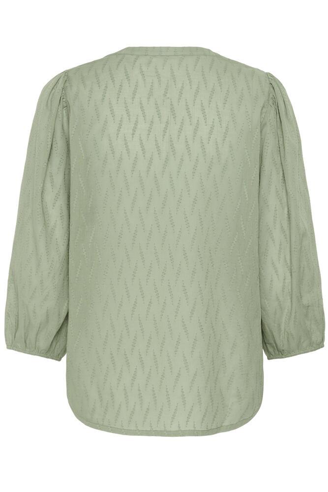 Smuk bluse fra KAFFE i en flot, støvet grøn nuance med let transparent i stoffet. Blusen er med en fin notch-udskæring og 3/4 ærmer med let puff og elastik, samt i en let og luftig kvalitet.
