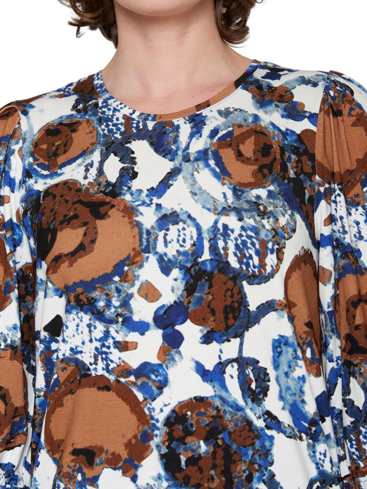 Blusen har et flot mønster i blå og brune nuancer og er fremstillet i 95% viskose, hvilket giver en dejlig blød og åndbar kvalitet