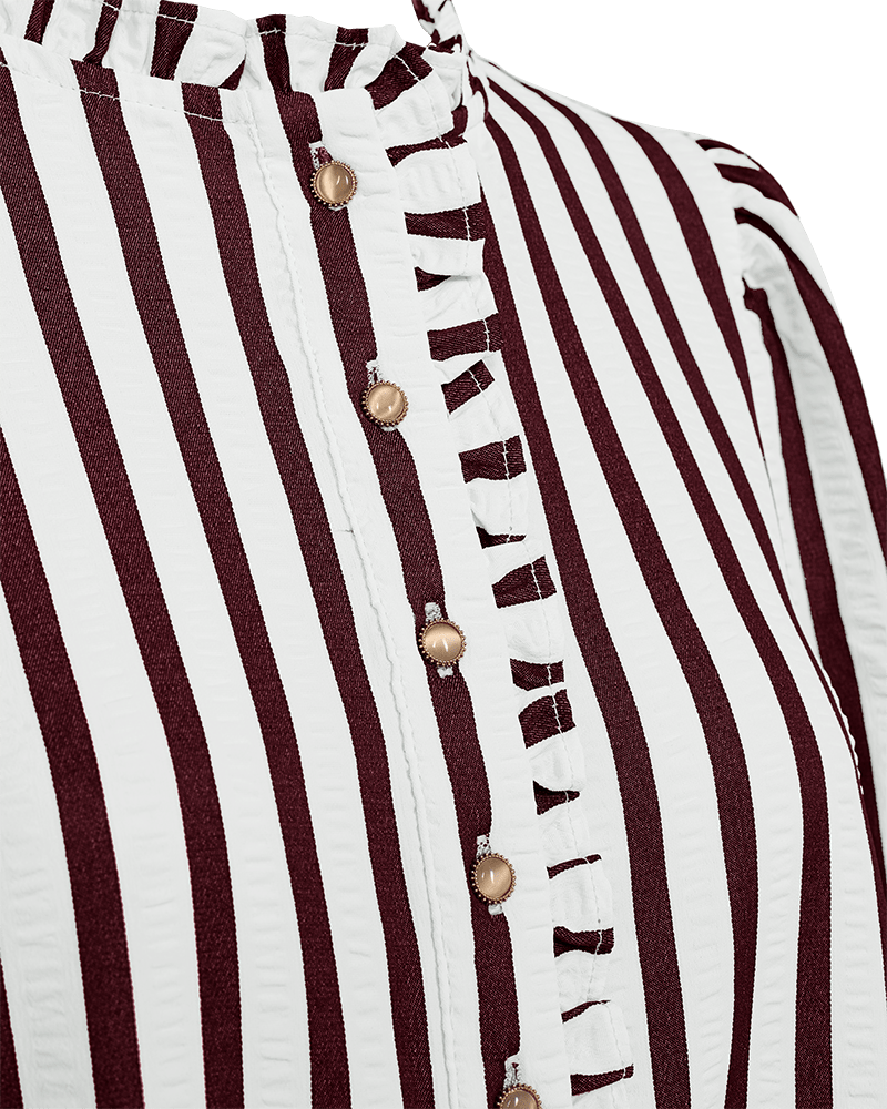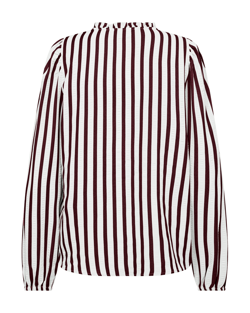 Blusen har flæser ved kraven samt stolpelukningen og lange ballonærmer med elastikkant.