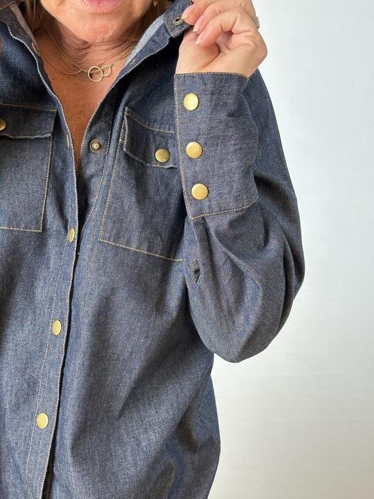 Skjorte fra Gaspar i denim en unik styles der kombinerer råt, sporty og feminine detaljer.  Skjorten har trykknapper i guld samt 3 knapper på manchetten. Den er pyntet med to brystlommer og har et meget stort flot logo i guld trykt på ryggen. Brug den lukket eller åbenstående med en flot top under eller som en let forårsjakke.