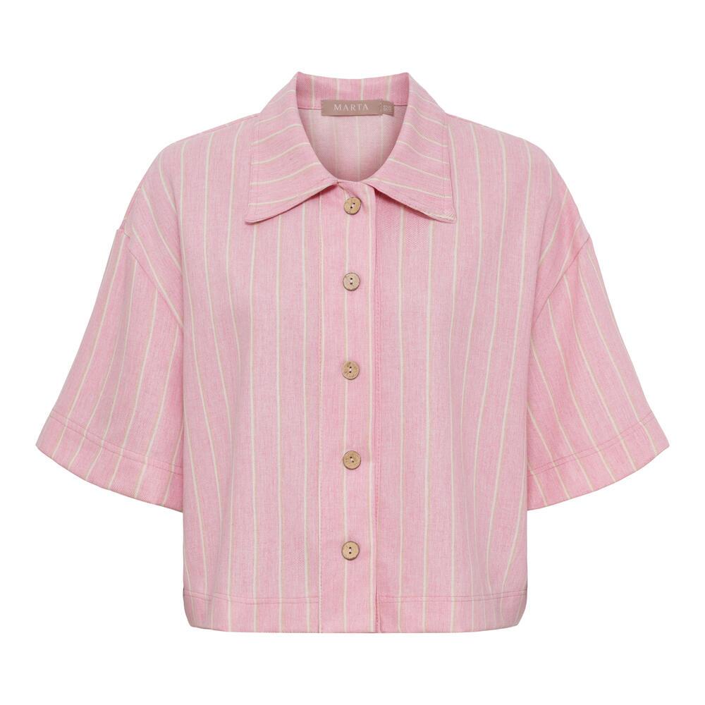 Jakke fra Marta du Châuteau i flot rosa nuance med striber og korte ærmer. Den har en enkel knaplukning og er let oversize, som giver et cool og moderne look. Brug den lukket eller åbenstående som en let jakke.