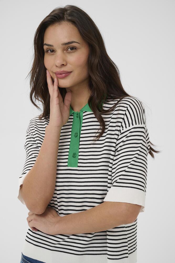 Strikbluse fra KAFFE med klassisk polo-krave og frisk grøn krave og stolpelukning. og den har hvid ribkant forneden og på ærmerne. Den afslappede pasform og bløde kvalitet gør den ideel til både hverdagsbrug og et casual look.