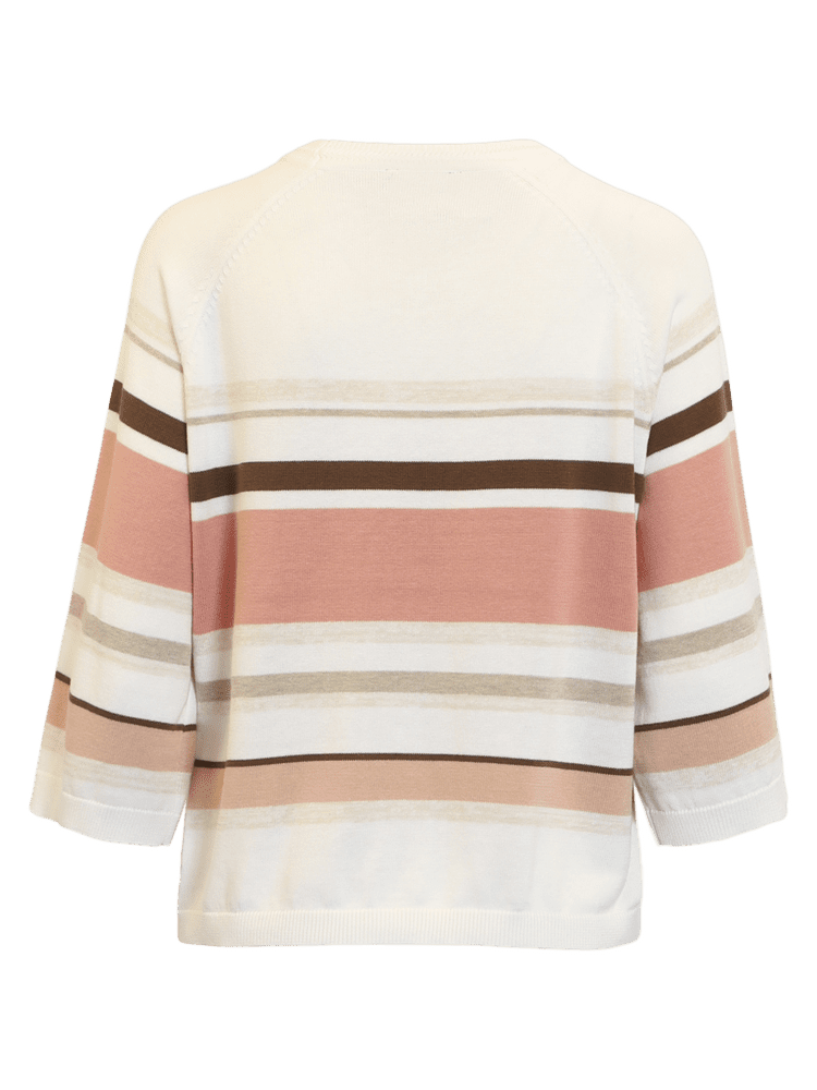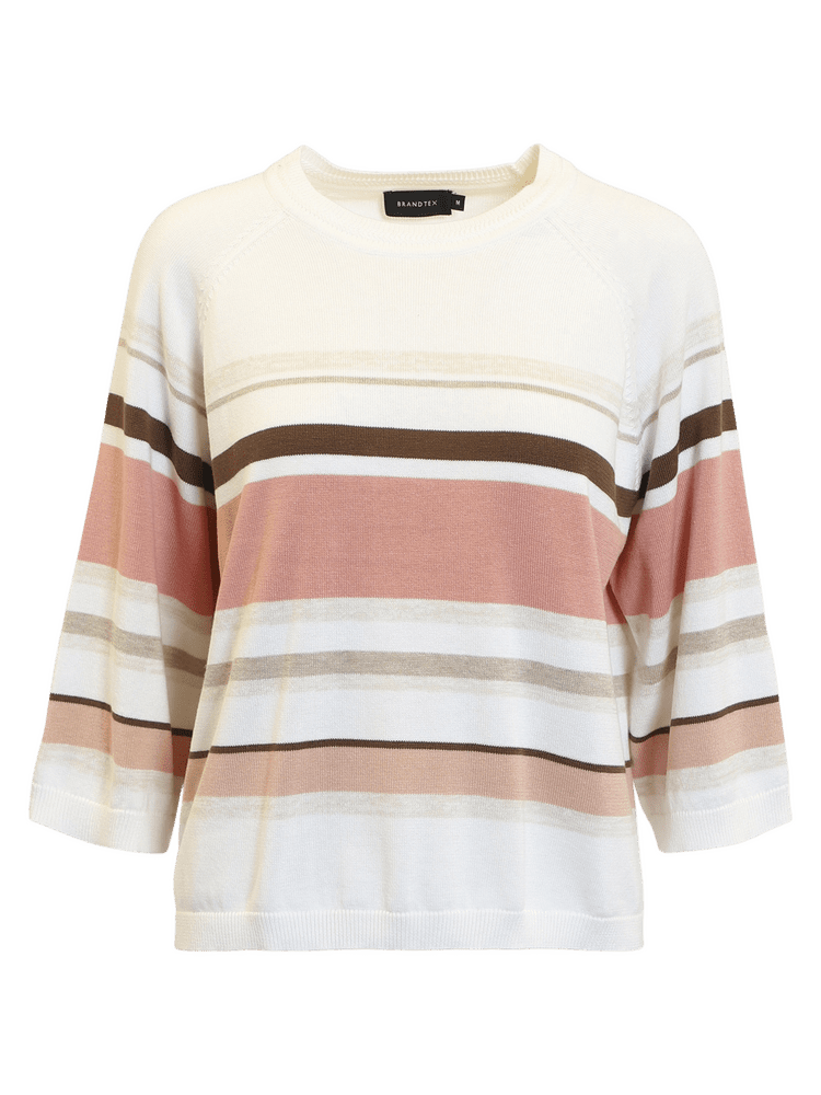 Blød og stilfuld strik fra Brandtex med moderne striber i varme nuancer. Striktrøjen har rund hals og 3/4 ærmer, samt ribkanter ved hals og ærmer, der giver et feminint touch.