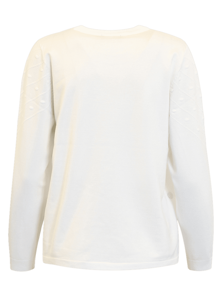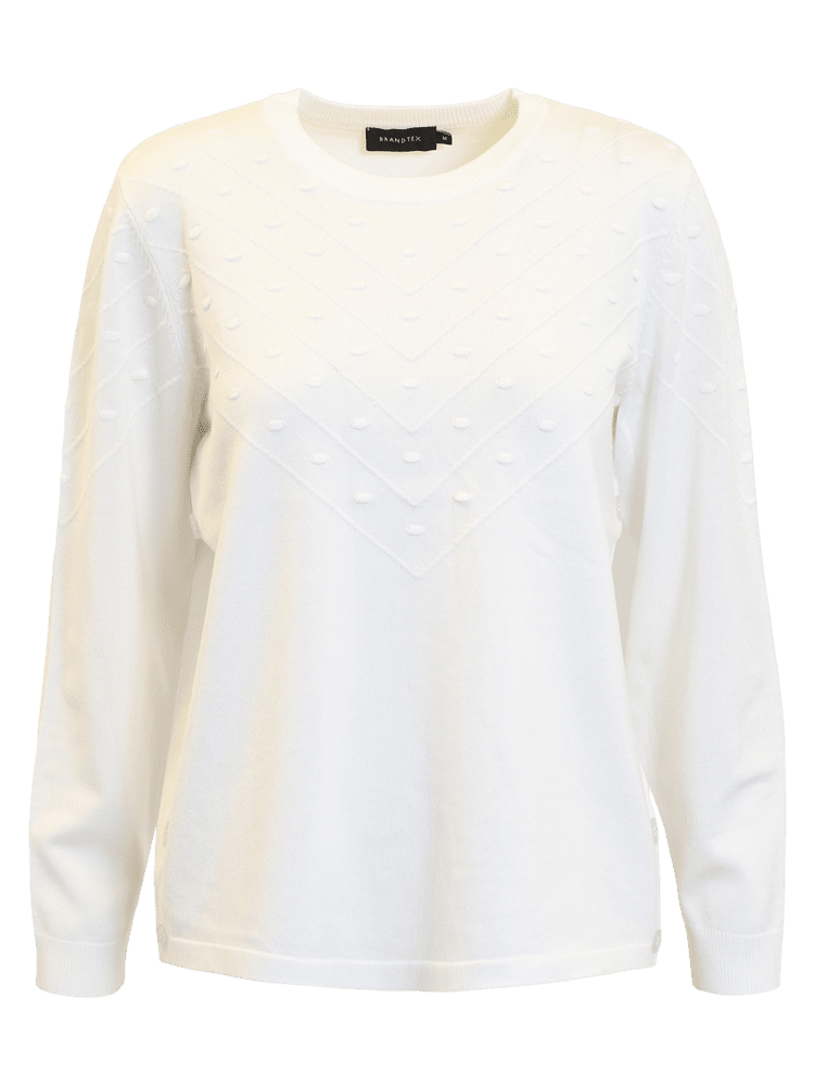 Klassisk og feminin strik fra Brandtex i en elegant offwhite nuance. Det fine strukturmønster med diskrete prikdetaljer giver et eksklusivt look, mens den bløde kvalitet sikrer høj komfort.