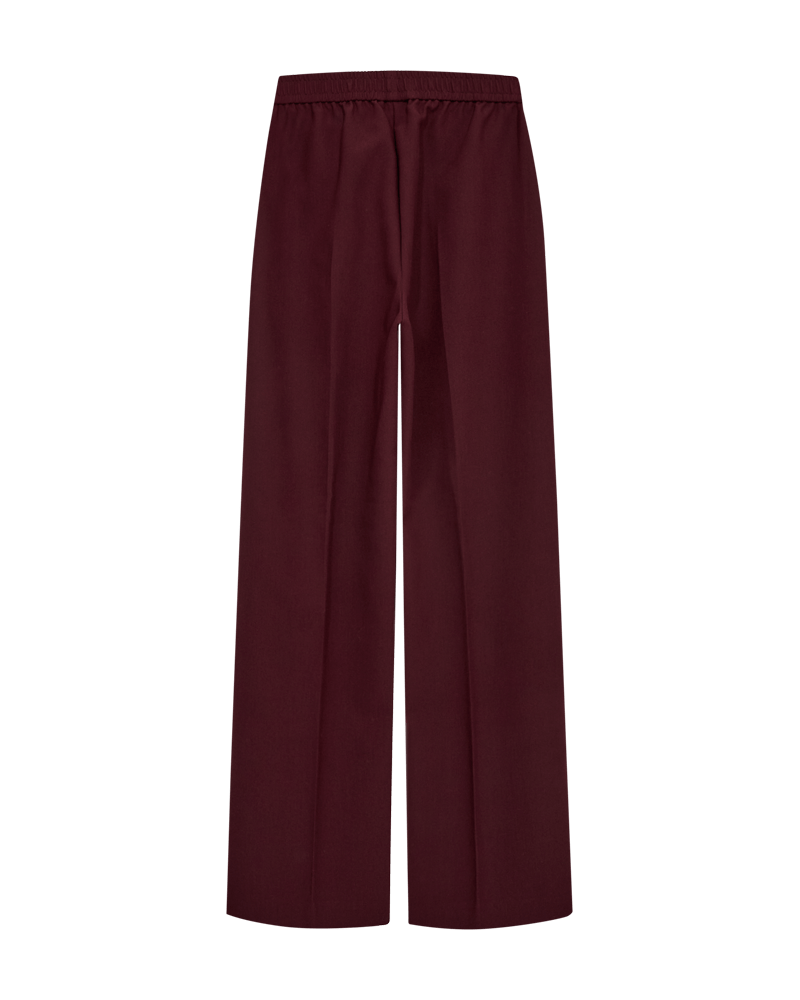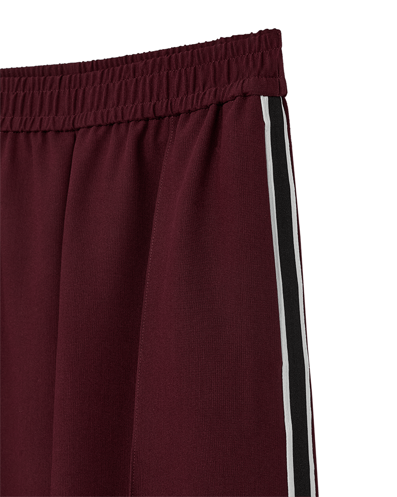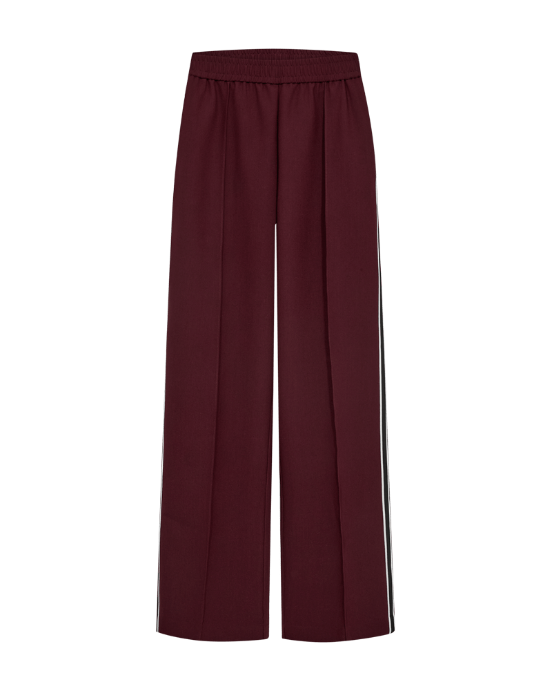Smarte og enkle bordeaux bukser med bred elastik i taljen, lige brede ben med pressefold foran samt en hvid og sort stribe ned langs siden.
