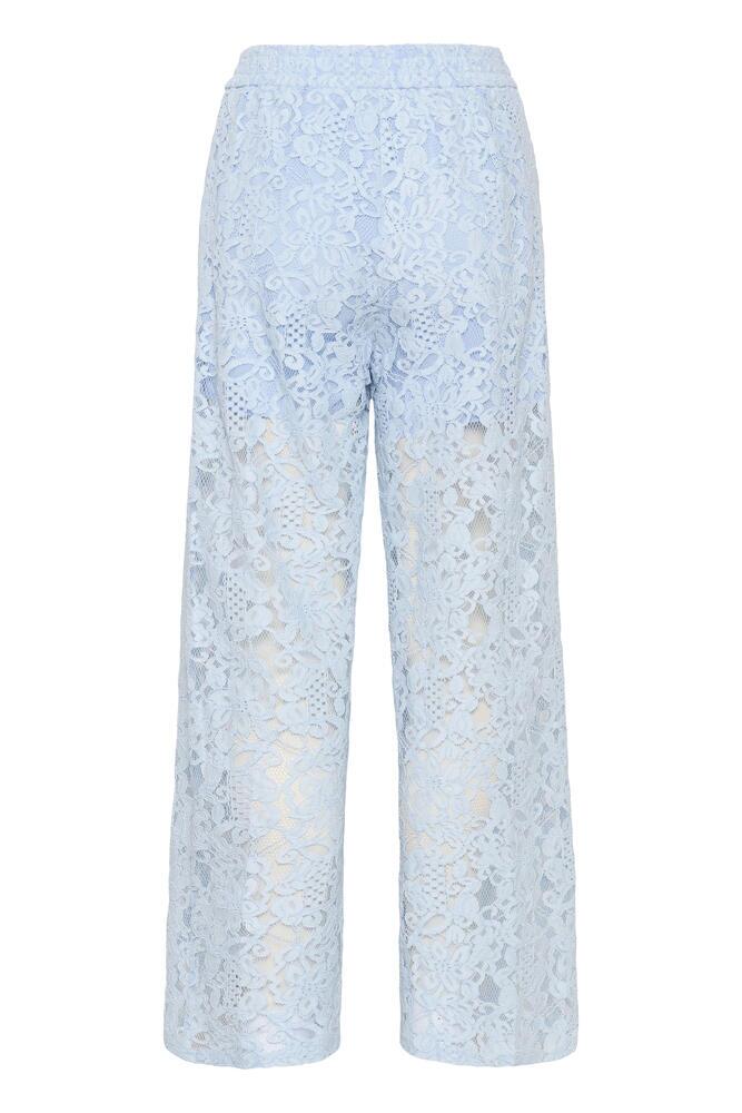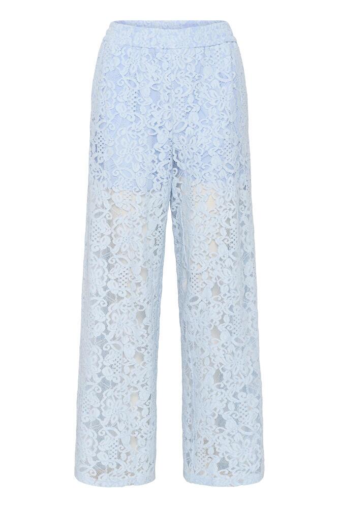Elegante bukser fra Kaffe i lyseblå blonde med et luftigt og feminint udtryk. De er med elastik i taljen, lige ben og sidelommer, en buks som er perfekte til sommerens fester eller et flot outfit til ferien.