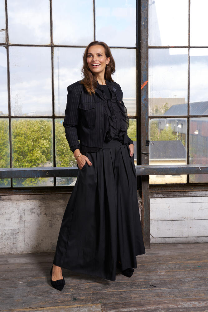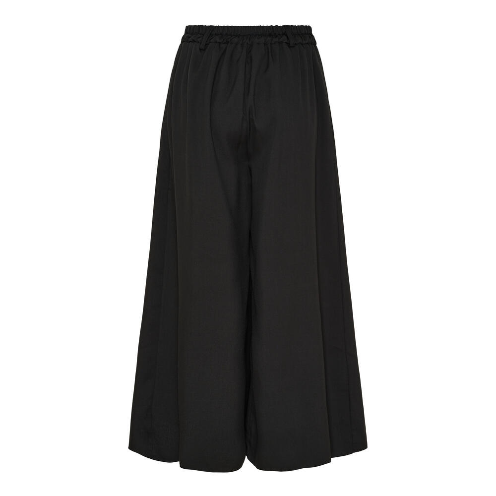 Bukserne har læg foran og meget vidde i benene, hvilket giver et nederdele look.