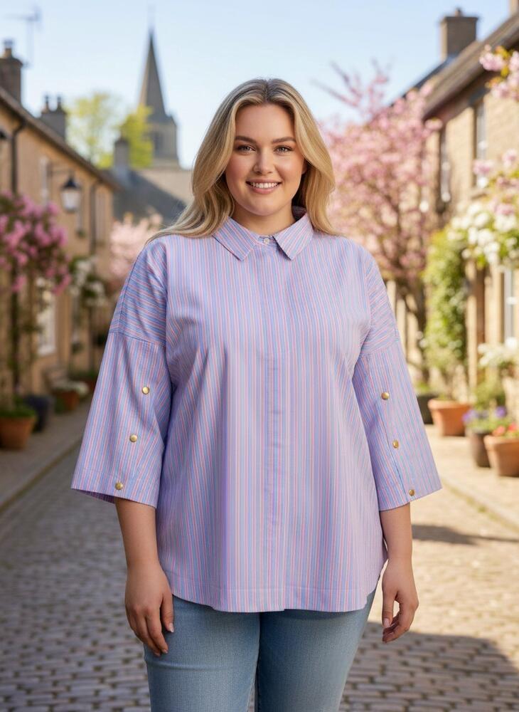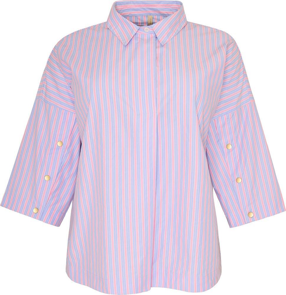 Sød og feminin Skjorte i plussize fra Cassiopeia i et moderne design med fine striber i blå og rosa nuancer. Skjorten har klassisk krave, løs pasform og 3/4 ærmer med dekorative knapdetaljer.