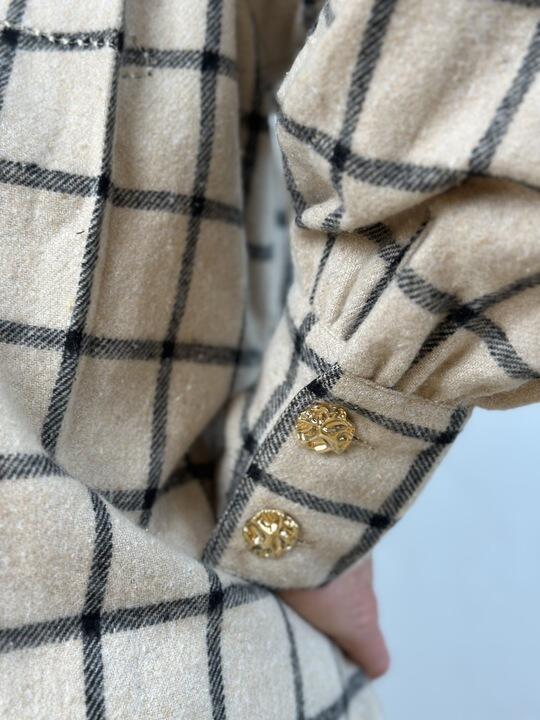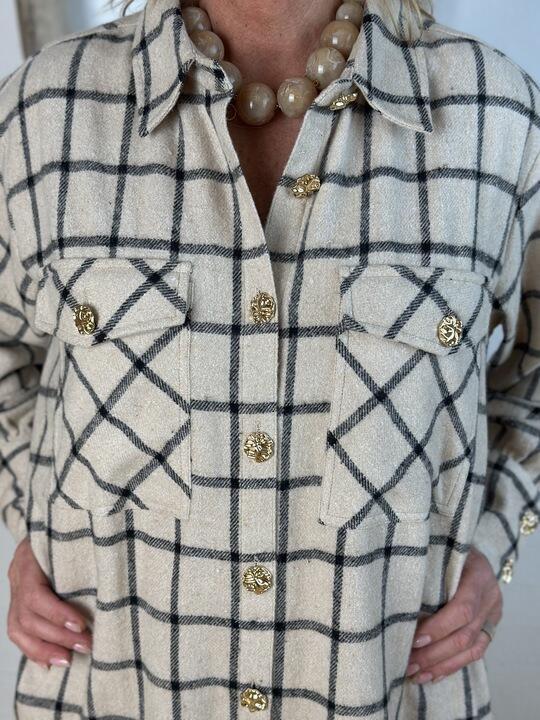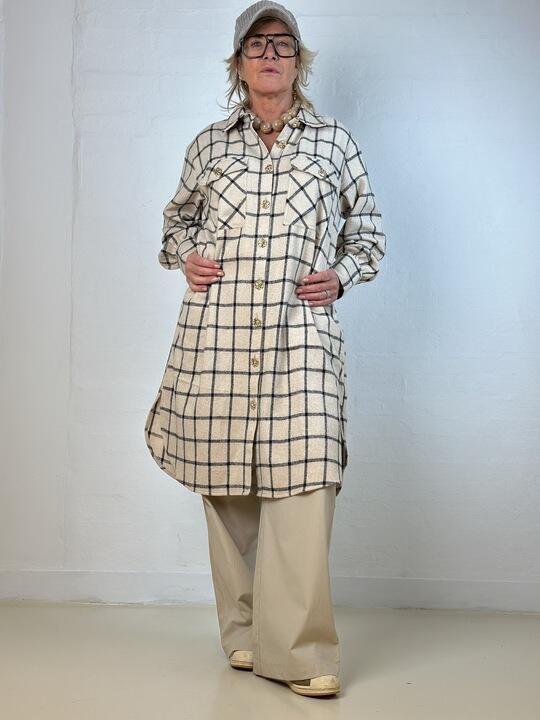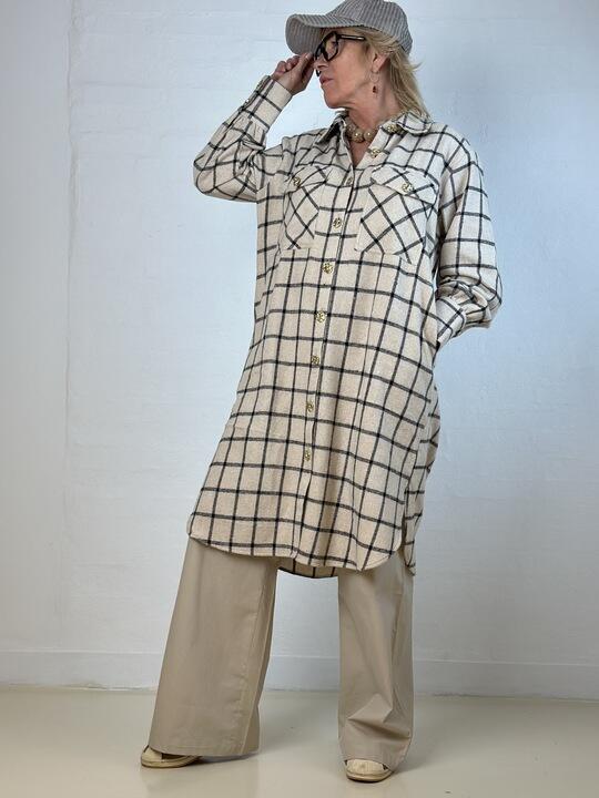 Moderne skjortekjole fra Gaspar i blød, ternet kvalitet med et afslappet og casual udtryk. Kjolen er meget anvendelig og tidløs og kan styles som en lukket kjole eller lad kjolen stå åben og sæt en top og et par jeans under. Den kan også bruges som let overtøj til foråret. Kjolen har afrundede kanter forneden.