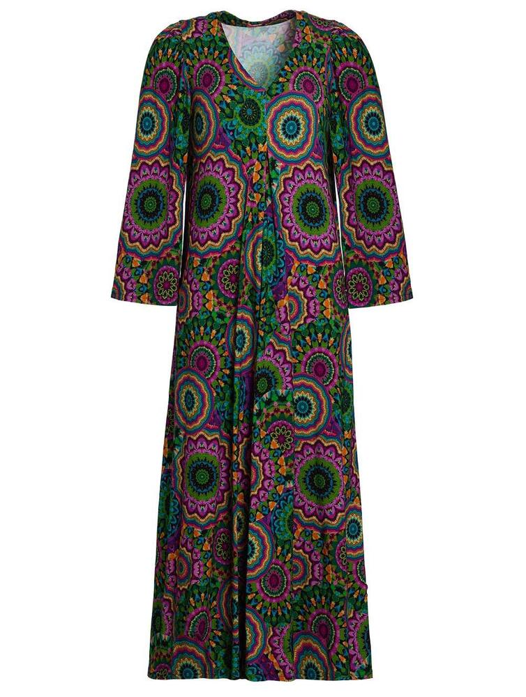 Kjolen har wienerlæg fra brystet og ned langs kjolens front, samt et flot farverigt flakon mønster, der giver illusionen af at være hæklet