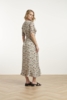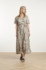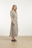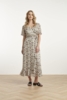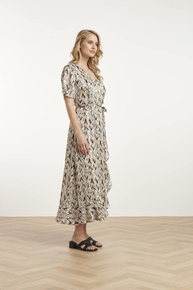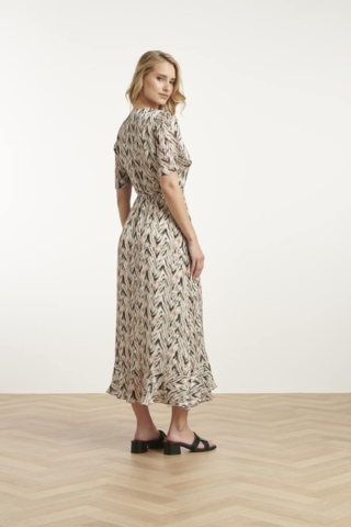 Kjolen har V-udskæring med overlapning og knap, samt overlapningen fortsætter ned langs kjolens skørt i flæser, hvilket giver et smukt og flydende look.