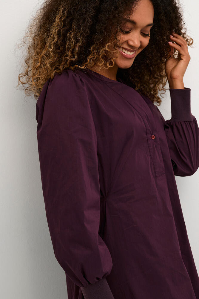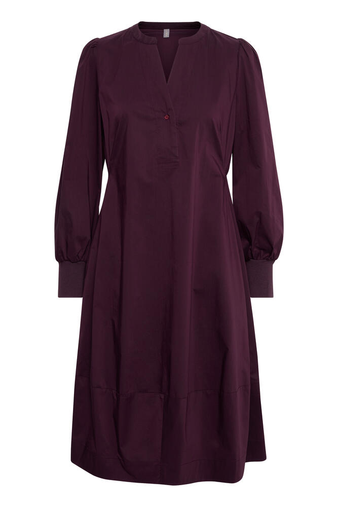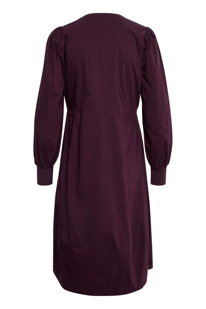 Kjolen har kinakrave med V-udskæring, stolpelukning samt lange ærmer med rib manchetter.