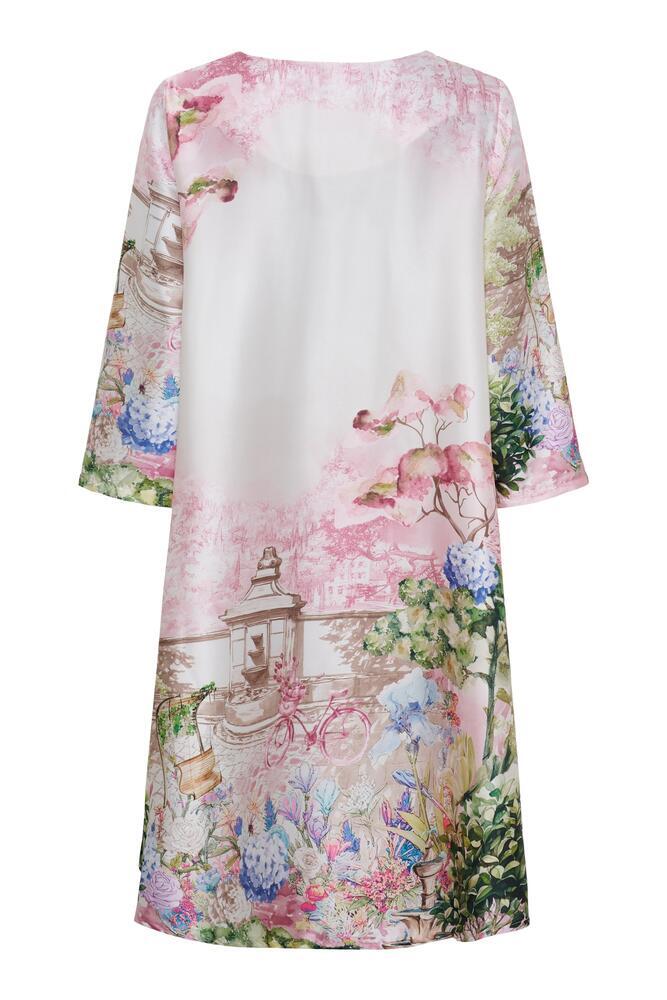 Kjole fra Marta du Château med smukt, romantisk print i bløde rosa nuancer. Kjolen har en afslappet pasform, rund hals og 3/4 ærmer, der giver et feminint og elegant look – perfekt til både hverdag og særlige anledninger.