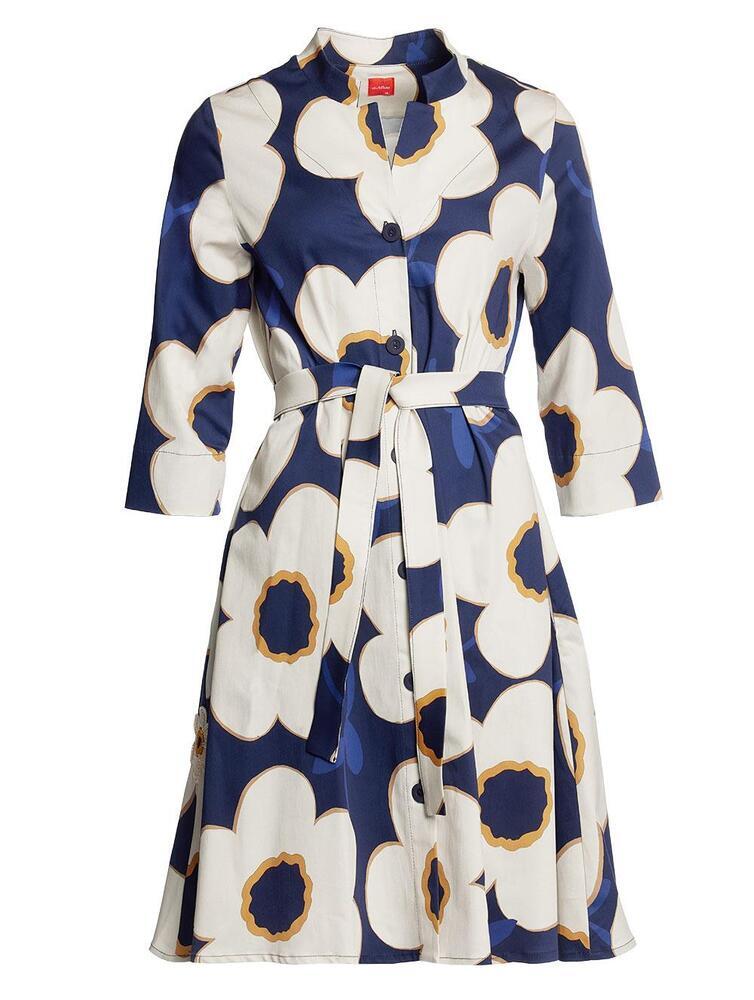 Smart 3 - i - 1 kjole fra du Milde i smukt storblomstret mønster i blå og creme nuancer. Kjolen kan styles på flere forskellige måder - som kjole uden bindebæltet, som åbenstående kimono/jakke og som skjortekjole med bindebæltet. Kjolen har en fin detalje i form af en hæklet blomst, der er påsyet forneden, i den ene side.
