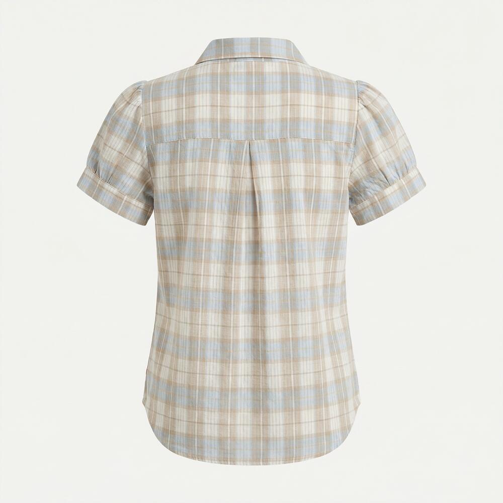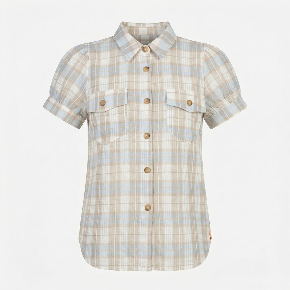 Feminin skjorte fra Lene Beier X Lind med et klassisk ternet mønster i bløde nuancer. De korte puffærmer og fine detaljer giver et moderne og afslappet udtryk, mens den lette kvalitet sikrer høj komfort.