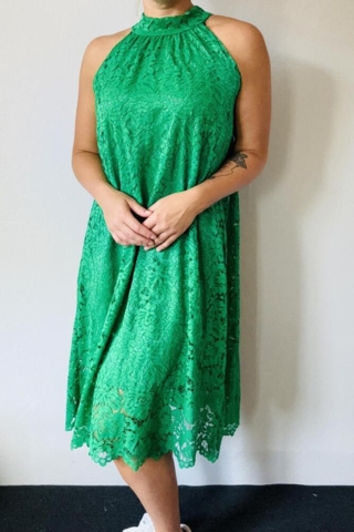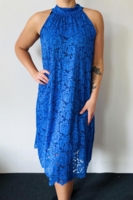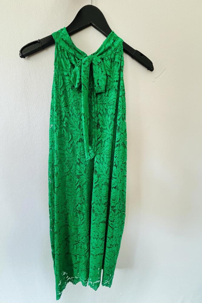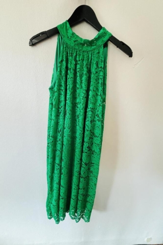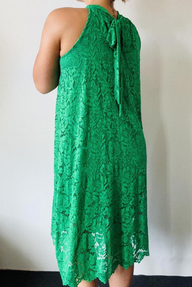 Kjolen er lavet i et smukt blondestof og har halterneck med sløjfe i nakken, hvilket giver et smukt udtryk.