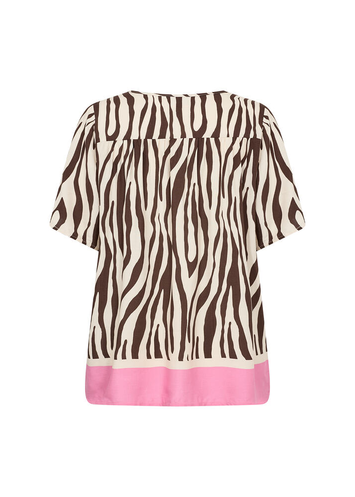 Blusen har rund hals, korte ærmer, zebra mønster samt en pink kant forneden