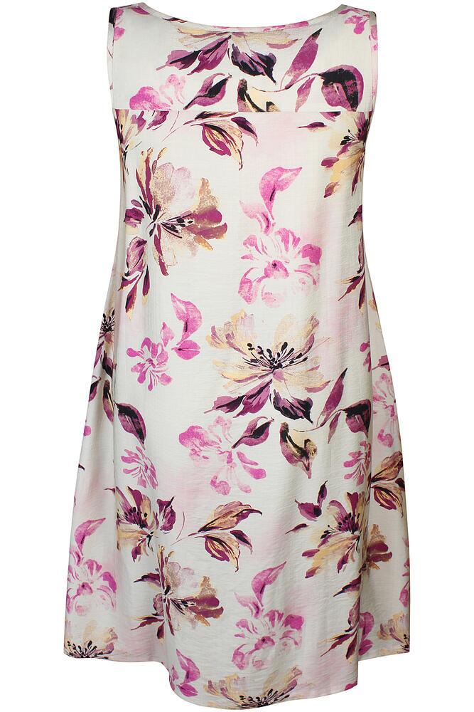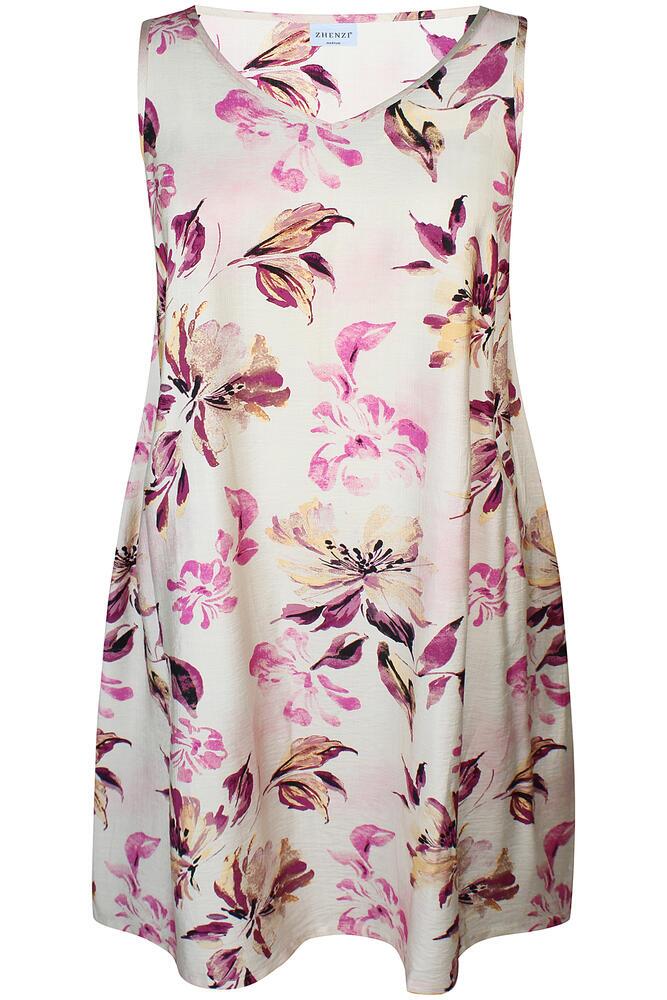 Smuk og feminin plussize kjole fra Zhenzi med et elegant blomsterprint i lyserøde, violet og beige nuancer. Kjolen har en løs og flatterende A-form med V-udskæring og brede stropper, der giver et let og luftigt udtryk.
