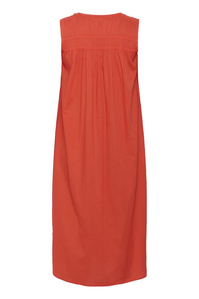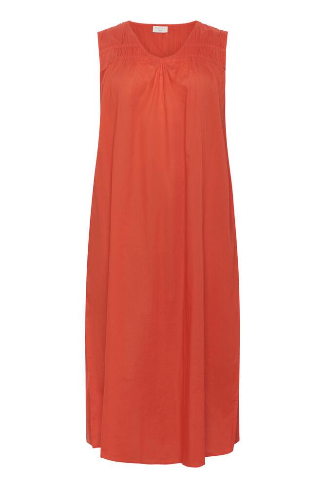 Smuk kjole i plussize fra KAFFE Curve i en varm orange nuance. Kjolen er lavet med en fin V-hals og søde rynke detaljer, for et feminint twist. Kjolen er desuden uden ærmer og i en sød midi længde.