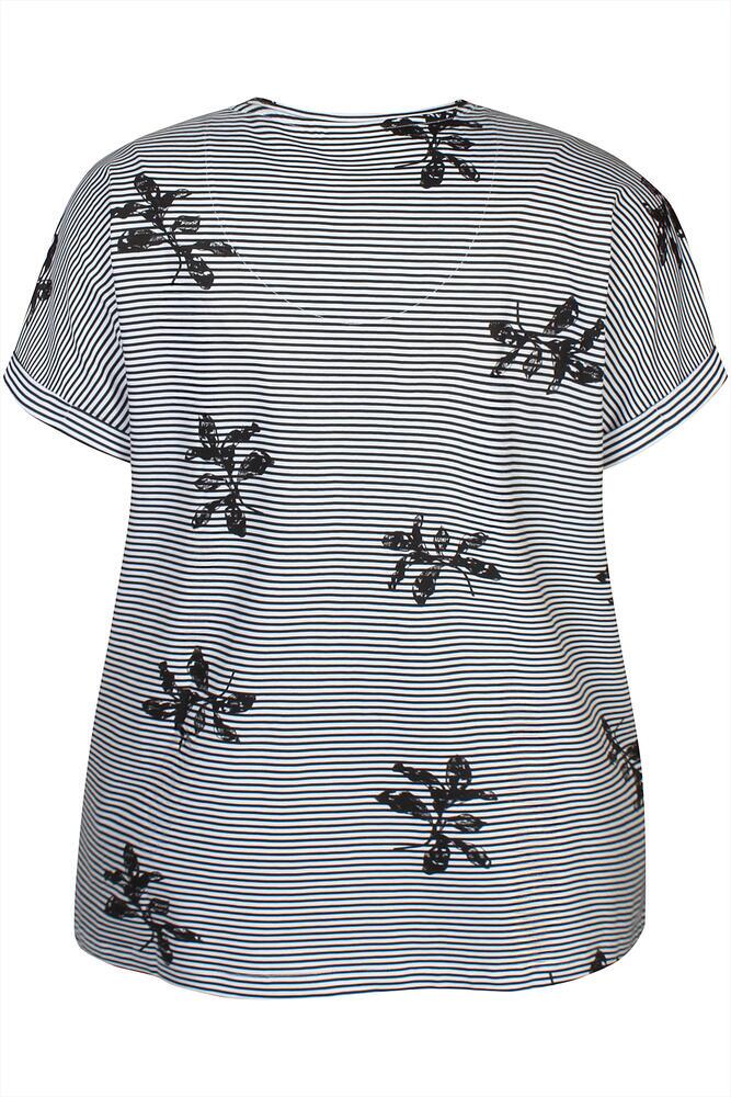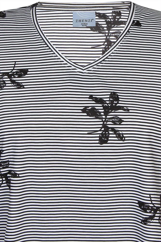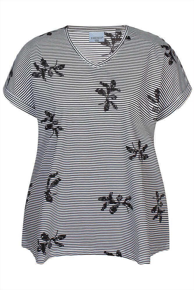Smart plussize T-shirt fra Zhenzi med klassiske striber og dekorativt print i sorte og hvide toner. Den søde V-hals og korte ærmer, samt den løse pasform, gør netop denne T-shirt til et must-have.