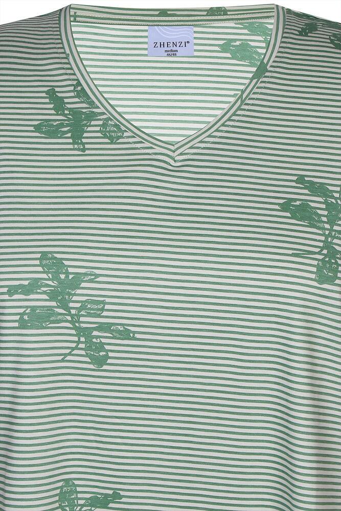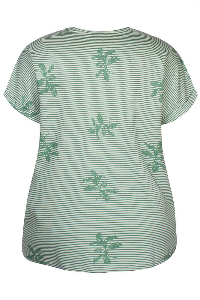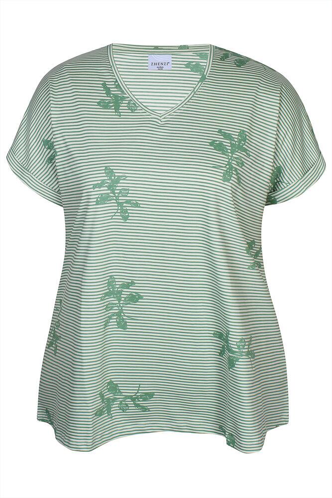 Smart plussize T-shirt fra Zhenzi med klassiske striber og dekorativt print i grøn og hvide toner. Den søde V-hals og korte ærmer, samt den løse pasform, gør netop denne T-shirt til et must-have.