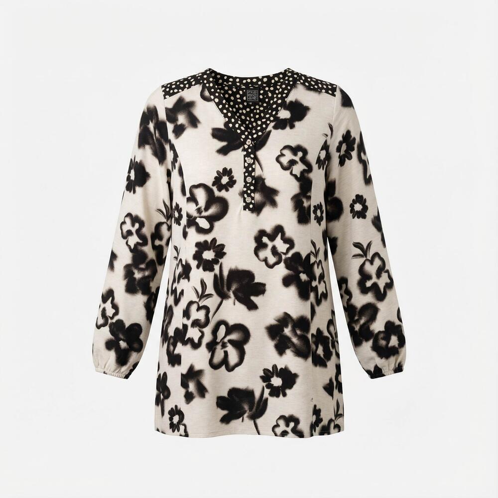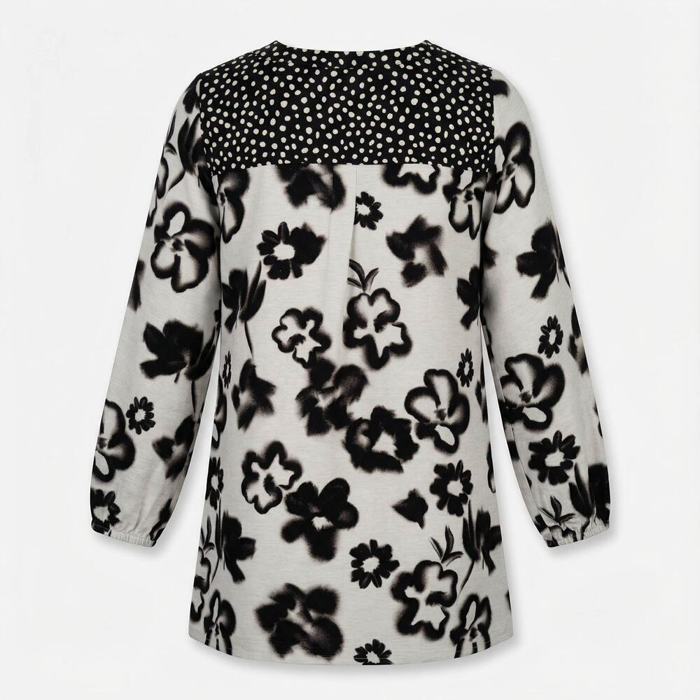 Smuk tunika i plussize fra Pont Neuf med et flot print af blomster. Et ekstra pift er stoffet med prikker syet på rundt i halsen og et lille stykke bagpå. Tunikaen har lange ærmer med elastik i kanten, og materialet er en dejlig åndbar kvalitet.