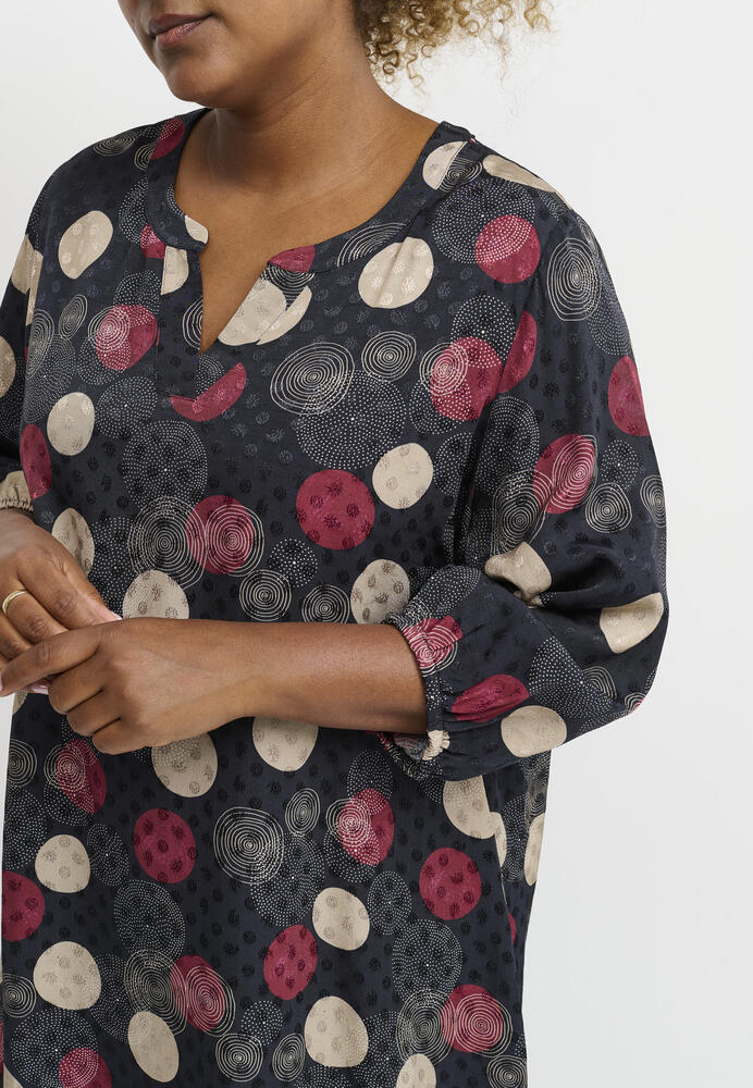 Tunikaen har rund hals med V-snit, 3/4 lange ærmer med elastikkant og runder forneden.
