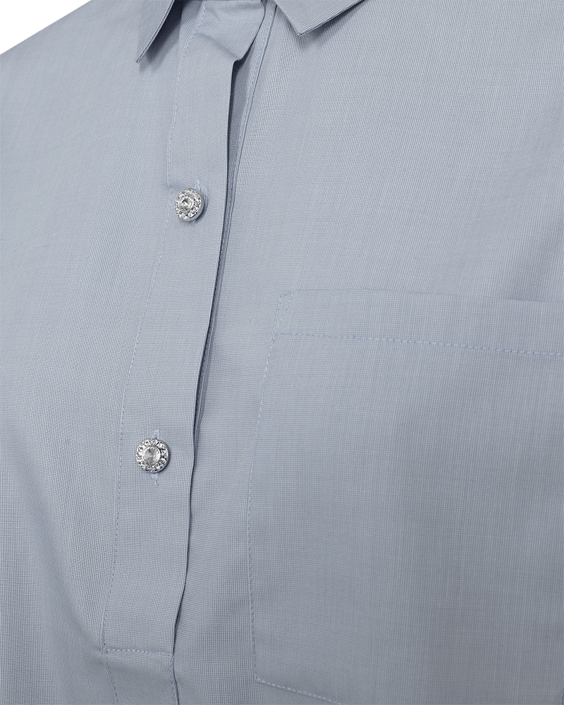 Skjorten har klassisk krave med stolpelukning og lange ærmer med lange manchetter, begge med elegante similisten knapper.