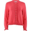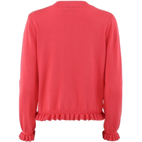 Cardiganen har flæser langs knaplukningen, kanten forneden samt ærmernes kant, hvilket giver et ekstra feminint look.