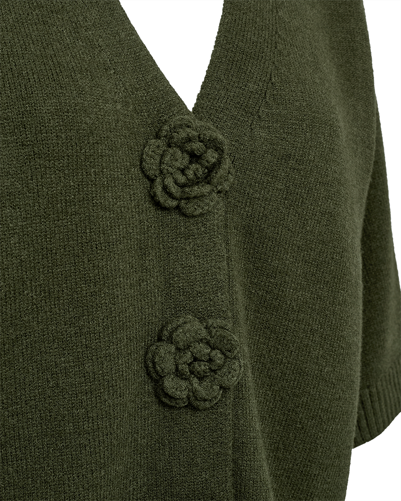 Cardiganen har V-udskæring, 3/4 lange ærmer og er gennemknappet med de sødeste hæklede blomster detaljer.