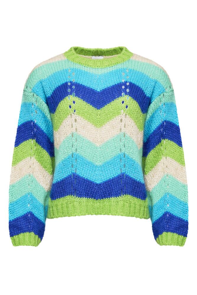 Smuk strikket pullover fra Lene Beier x Lind kombinerer et iøjnefaldende zigzag-mønster i flotte blå og grønne farver, der giver et feminint udtryk. Skabt i en lækker italiensk mohairblanding, der føles blød og let på kroppen.