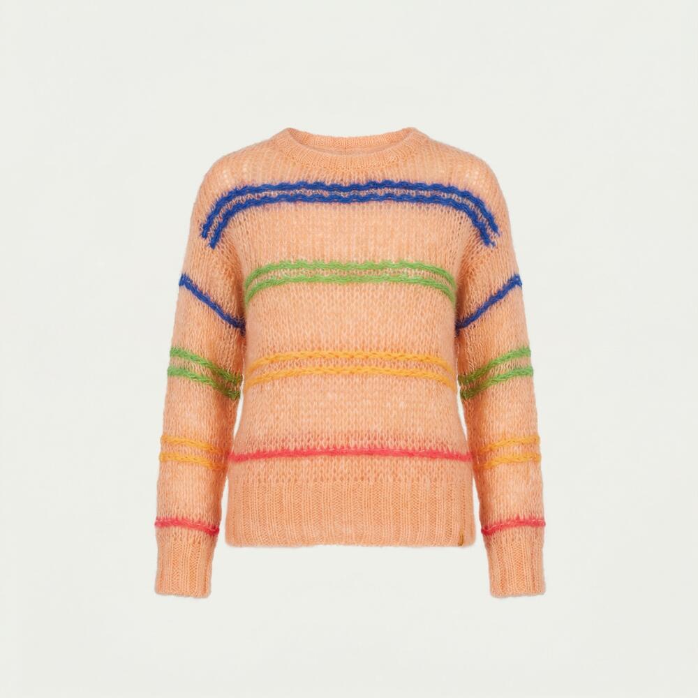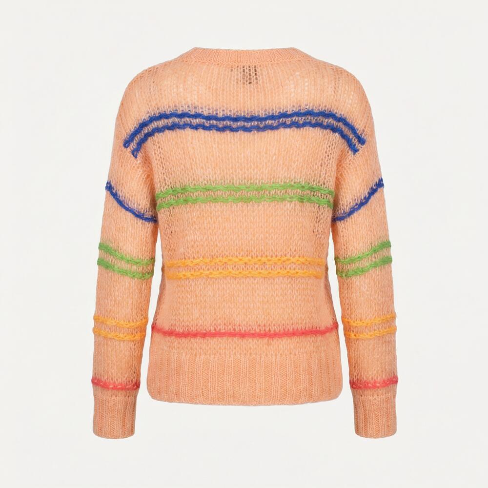 Smuk strikket pullover fra Lene Beier x Lind med flotte striber i blå, grøn, orange og pink, der giver et feminint udtryk. Skabt i en lækker italiensk mohairblanding, der føles blød og let på kroppen.