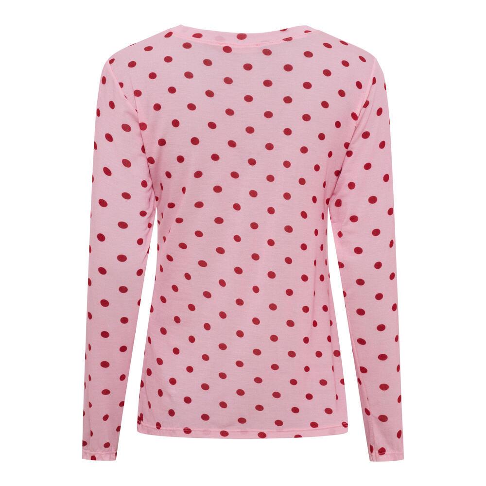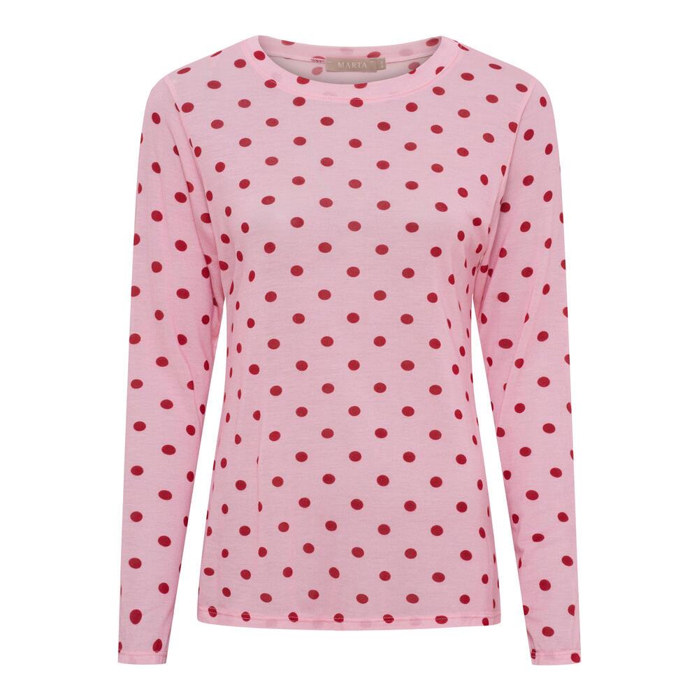langærmet T-shirt fra Marta du Château i en sommerlig pink farve med fine røde prikker. Blusen er lavet i en blød mikromodal blanding, som gør den til en perfekt erstatning for meshbluser, til lag-på-lag.