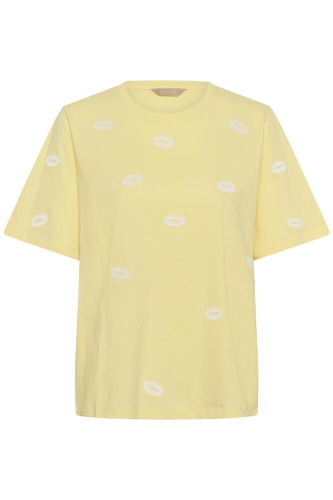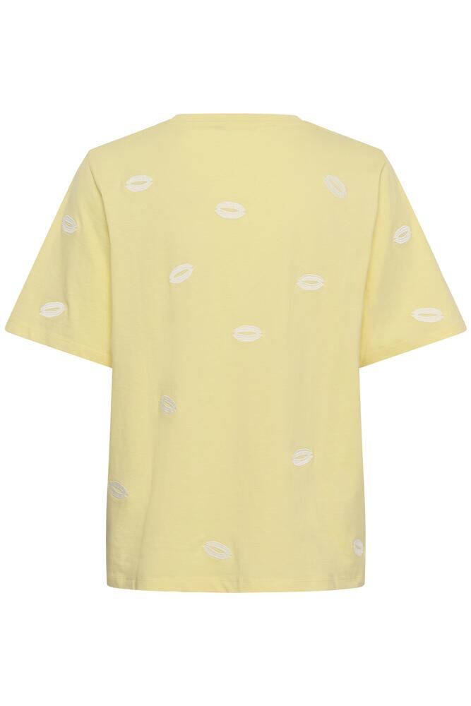 Moderne T-shirt fra CULTURE i en flot sommerlig gul farve. T-shirten har rund hals, korte ærmer og er dekoreret med broderede læbe-motiver i en naturlig hvid farve, der giver et unikt look.