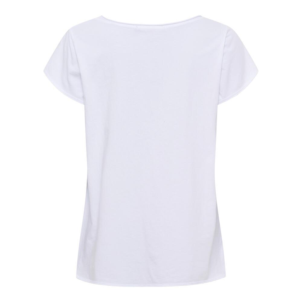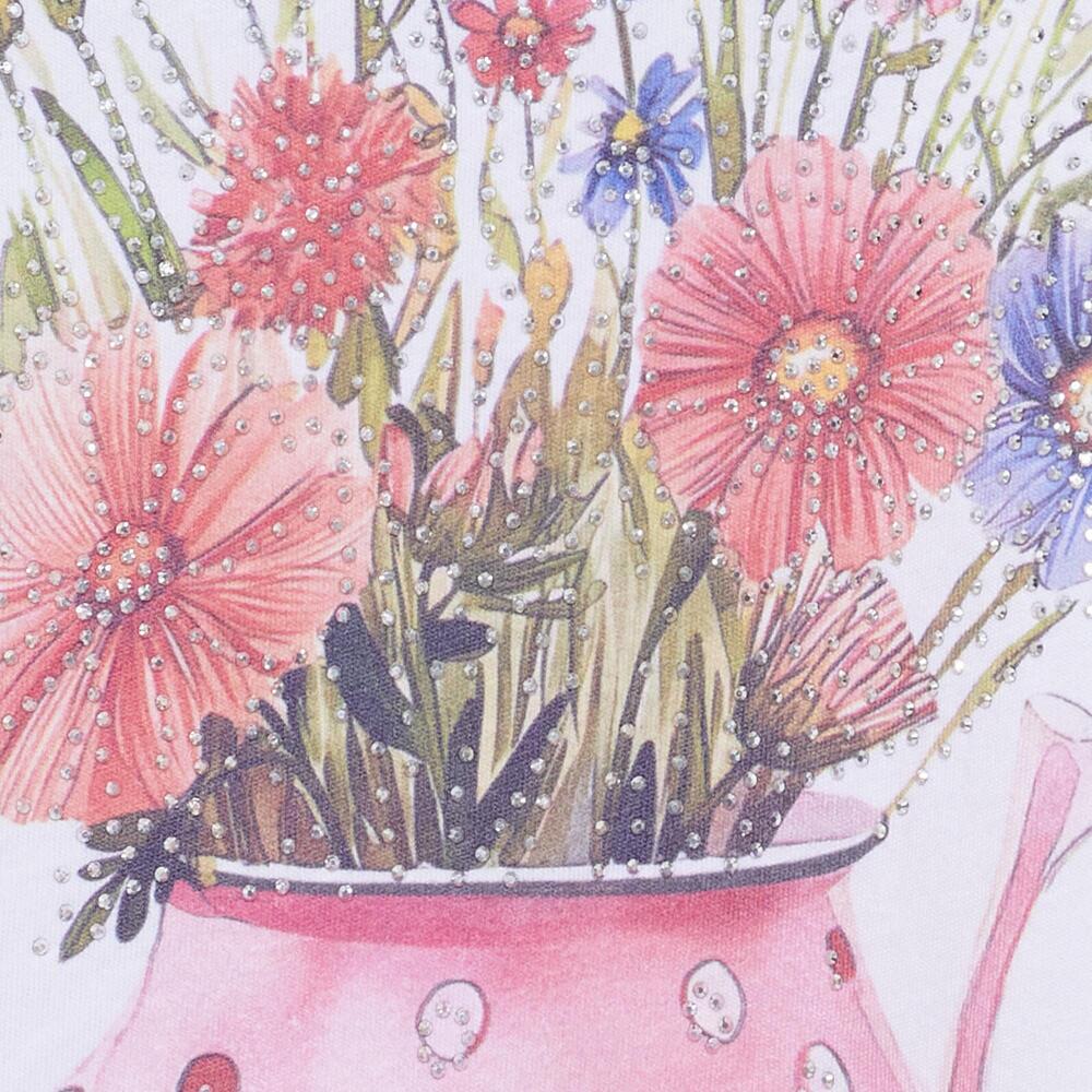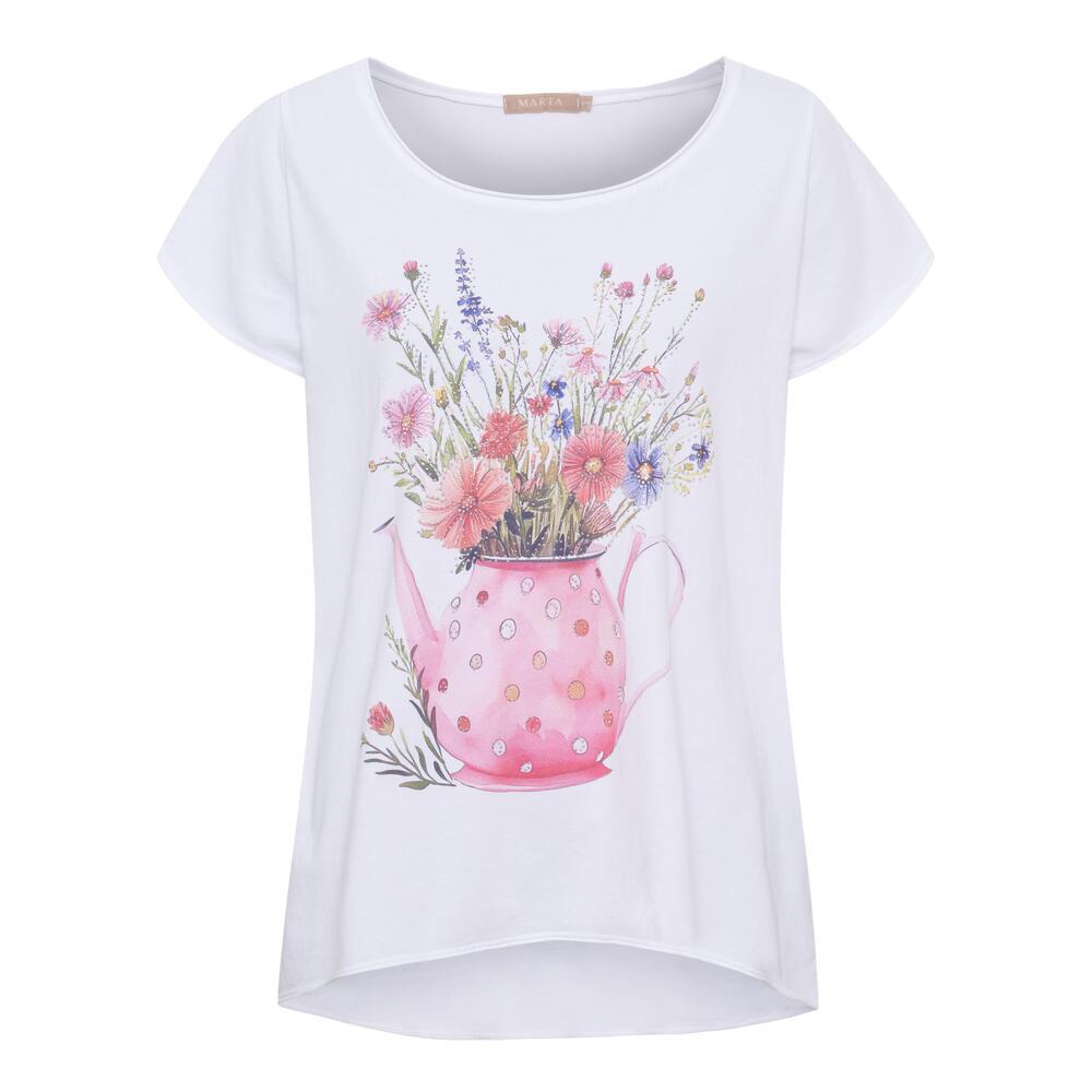 Sød T-shirt fra Marta du Château i blød kvalitet med rund hals og kort ærme. T-shirten har et dekorativt print med blomster og en lyserød kande på fronten samt en let længere bagkant for et feminint look.