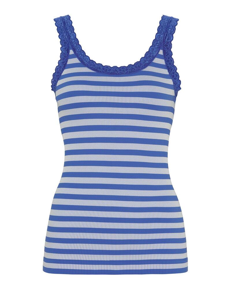 Top fra Tim & Simonsen i en flot blå nuance. Toppen er med et stribet design, og søde blondekanter ved hals og stropper, samt lavet i en dejlig blød ribkvalitet, for god komfort.