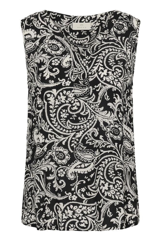 Feminin top fra KAFFE i et smukt paisley mønster. Toppen er lavet i et ærmeløst design og med en fin V-udskæring, samt en løs og luftig pasform.