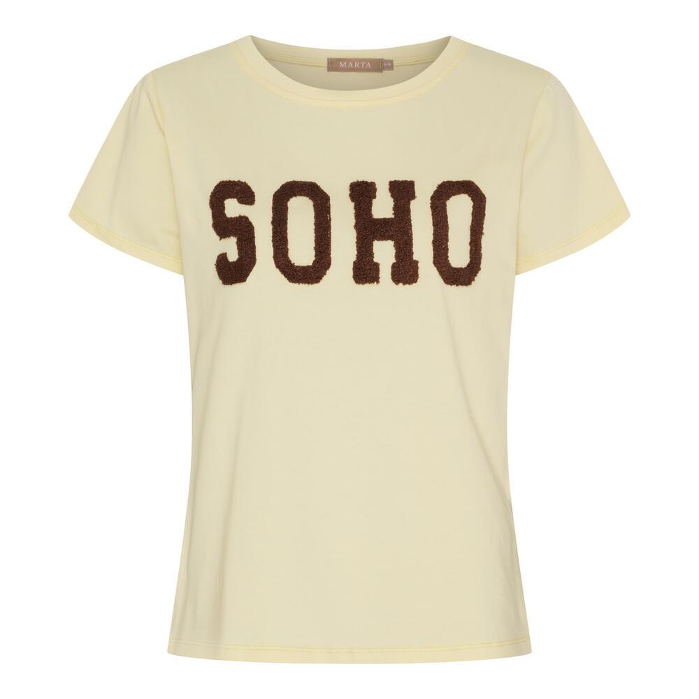 T-shirt fra Martha du Château er et sikkert valg til hverdagsgarderoben. Den bløde kvalitet og den klassiske pasform gør den perfekt til afslappede outfits med kant. Den runde hals og korte ærmer giver et tidløst udtryk, mens det markante “SOHO” bouclé-print foran tilfører struktur og karakter. Perfekt alene eller som lag-på-lag.