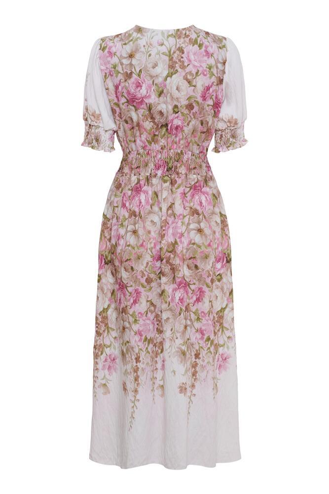 Kjole fra Marta du Château i et romantisk design med smukt blomsterprint i rosa og beige nuancer. Kjolen har en feminin V-udskæring, korte ærmer med smock-detaljer og elastisk talje, der fremhæver figuren.