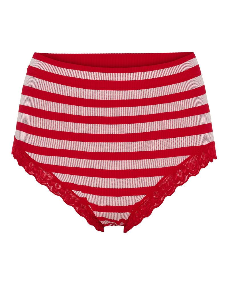 Midi Trusse fra Tim & Simonsen med højtalje i rød stribet. Trussen er fremstillet i et mikrofiber materiale, som er åndbart og temperaturregulerende, hvilket sikrer god komfort.