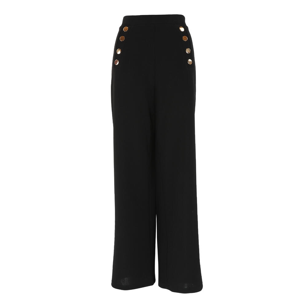 Stilrene bukser fra Continue med et eksklusivt og feminint udtryk. Den elastiske talje sikrer høj komfort og en flot pasform, mens de dekorative guldfarvede knapper tilfører et elegant touch. Den lige, brede benvidde giver et moderne og klædeligt look – perfekt til både arbejde og fest.